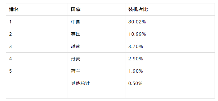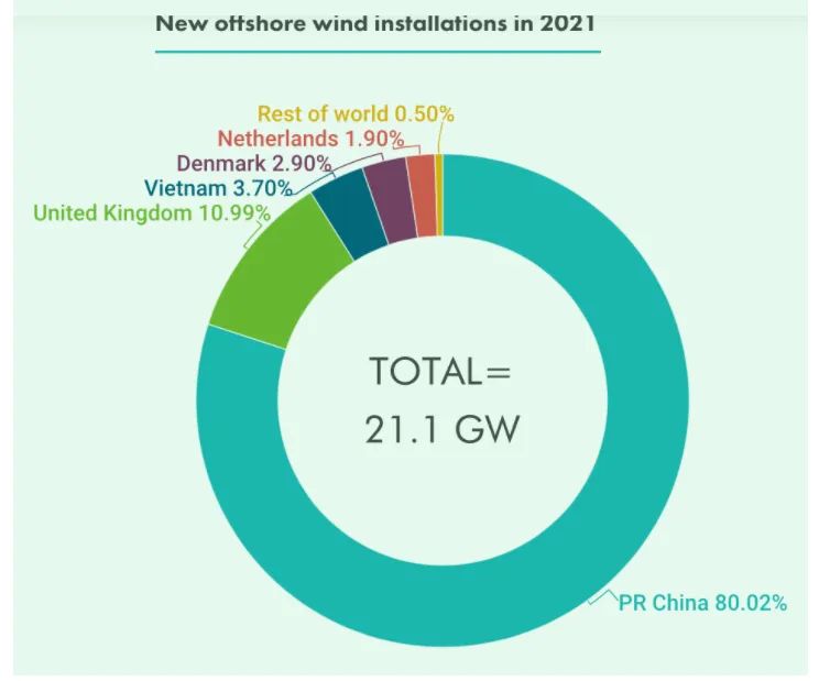 2021年全球海上风电新增装机21.1GW,具体国家排名如下: