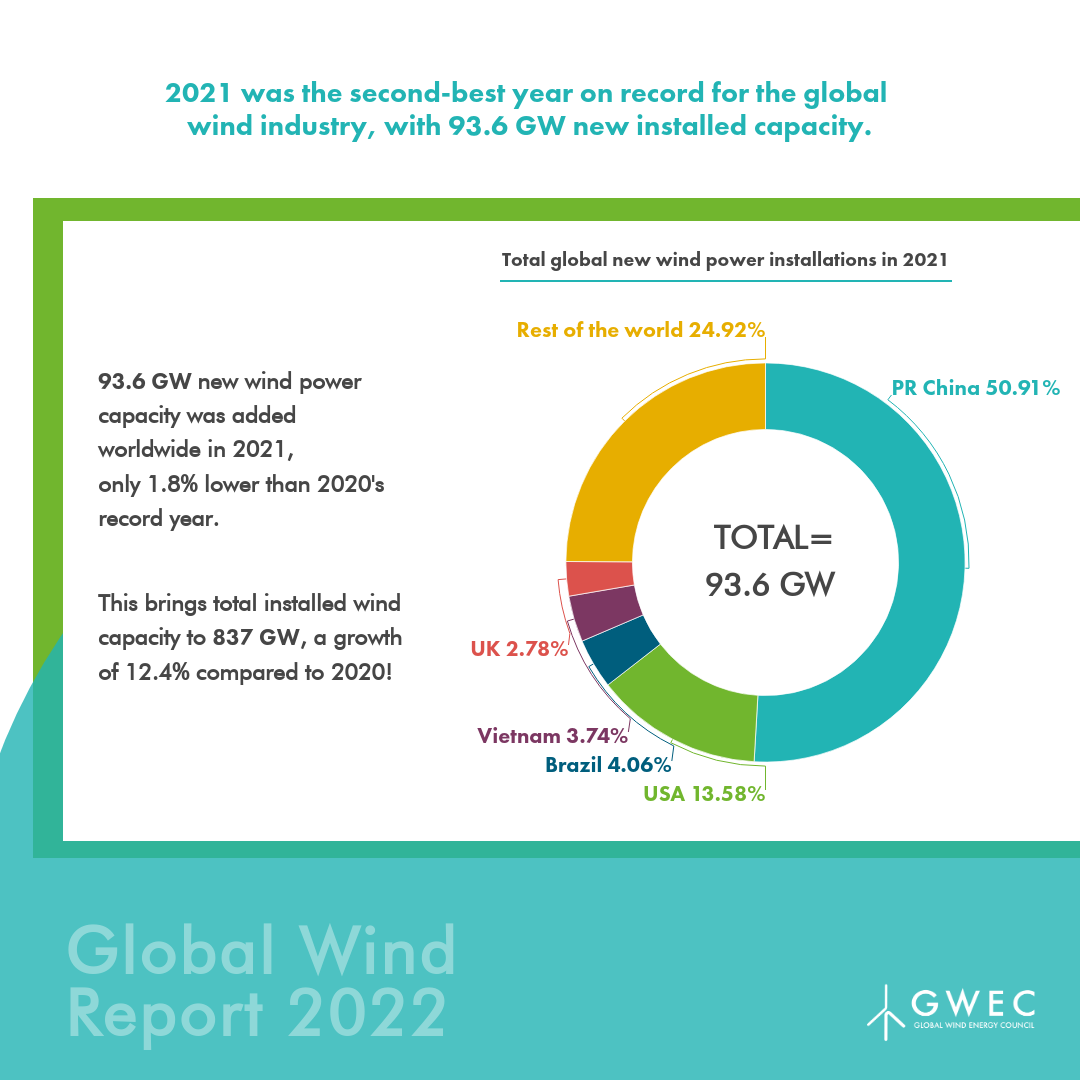 2021年全球风电新增装机93.6GW,具体国家排名如下:
