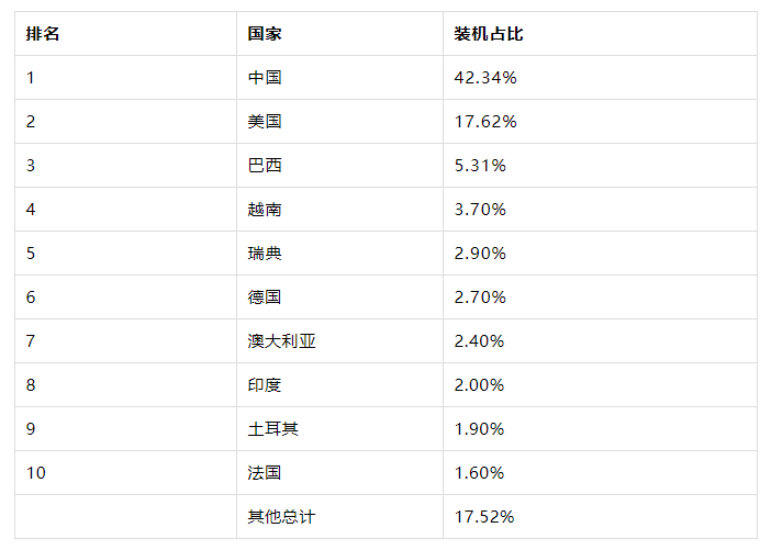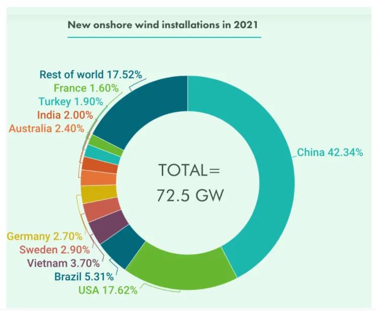 2021年全球陆上风电新增装机72.5GW,具体国家排名如下:
