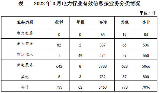 电力行业排在首位,有效信息数量为7036件,占全部有效信息的67.76%。群众关注的内容主要集中在供电服务、故障停电、供电安全等方面。(2022年3月电力行业有效信息按业务分类情况见表二)