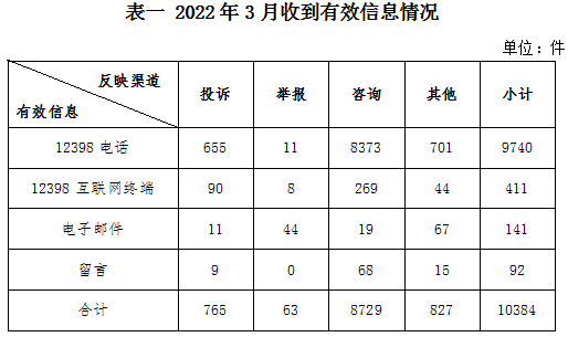 2022年3月,国家能源局12398能源监管热线(以下简称12398热线)共收到有效信息10384件(包含投诉、举报、咨询和其他诉求类别),环比增加24.12%,同比增加23.14%。(2022年3月收到有效信息情况见表一)