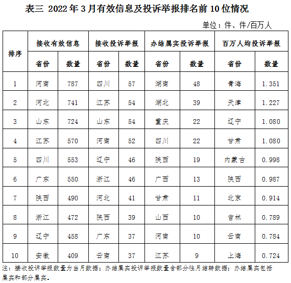 各省(自治区、直辖市)按照接收的有效信息数量排序,河南、河北、山东、江苏、四川、广东、陕西、浙江、辽宁、安徽排在全国前10位;按照接收的投诉举报数量排序,四川、江苏、山东、河南、辽宁、浙江、河北、陕西、广东、云南排在全国前10位;按照办结属实的投诉举报数量排序,湖南、湖北、重庆、四川、陕西、广西、甘肃、山西、河南、江苏排在全国前10位;按照百万人均投诉举报数量排序,青海、天津、辽宁、甘肃、内蒙古、陕西、北京、吉林、云南、上海排在全国前10位。(2022年3月有效信息及投诉举报排名前10位情况见表三)