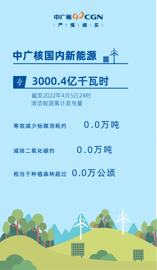 中国广核集团数据显示,截至 2022 年 4 月 5 日 24 时,中国广核新能源控股有限公司风电、太阳能等清洁电力累计上网电量(自 2007 年 12 月 26 日始)达到 3000.4 亿千瓦时。