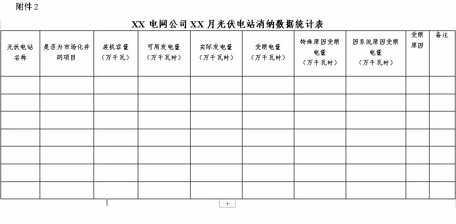 第十条 电网企业应于每月15日前以省为单位报送上月经营区域内光伏电站可用发电量、实际发电量、受限电量、利用率等消纳统计数据,并将光伏电站消纳数据统计表(附件2)、分布式及其他光伏发电项目消纳数据统计表(附件3)通过全国新能源电力消纳监测预警平台报送国家能源局并抄送所属辖区内国家能源局派出机构,相关计算依据《光伏电站消纳利用率计算导则》(附件4)。电网企业保留光伏电站运行相关数据3年以上,以备抽查。