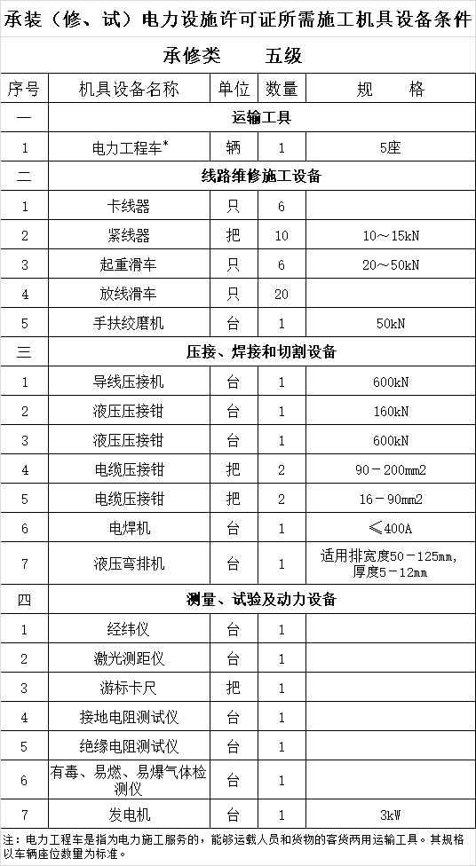2.一至五级承修类承装(修、试)电力设施许可证所需机具设备条件