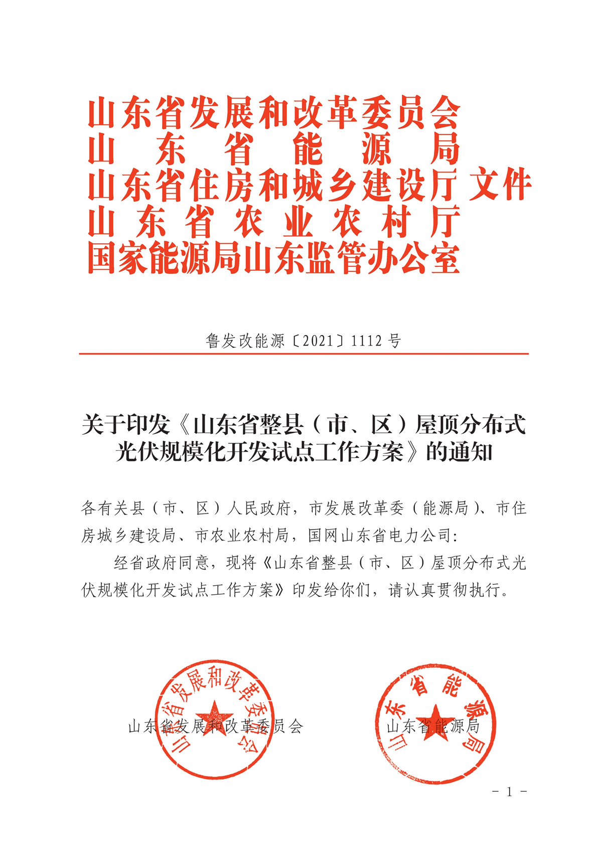 经省政府同意,现将《山东省整县(市、区)屋顶分布式光伏规模化开发试点工作方案》印发给你们,请认真贯彻执行。