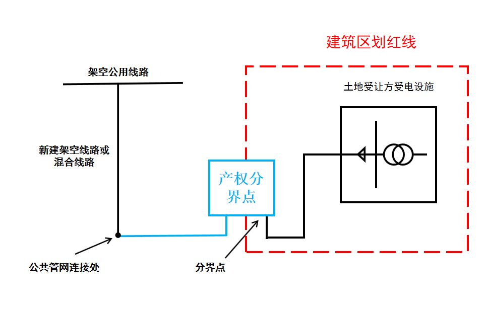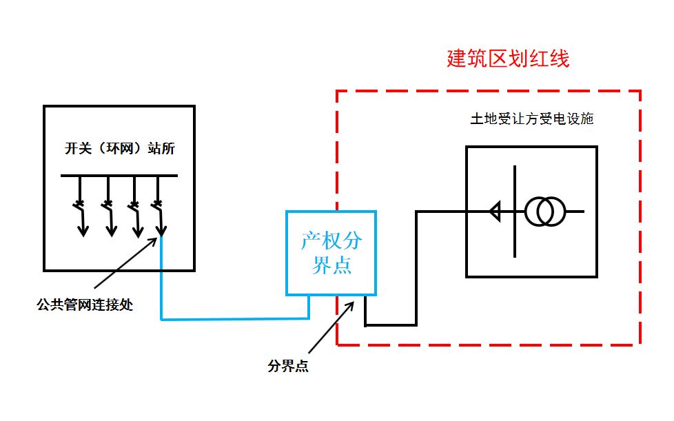 高压用户项目电力接入工程范围为用户建筑区划红线处产权分界点(新上环网柜、计量柜等)至公共管网连接处的所有电力工程,以土地受让方高压电缆与产权分界点搭接处为分界点,分界点电源侧供电设施属于电力接入工程范围,负荷侧受电设施由土地受让方投资建设。