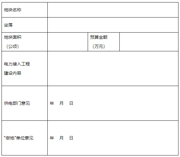 1、项目启动。储备土地前期开发时,“做地”主体应及时书面告知供电企业。供电企业结合项目落地区块电力接入现状,统筹考虑区域电网规划,根据项目终期用电规模出具《电力接入工程前置条件书》(见附件3),编制项目图纸和概(预)算书,并提交给“做地”主体。