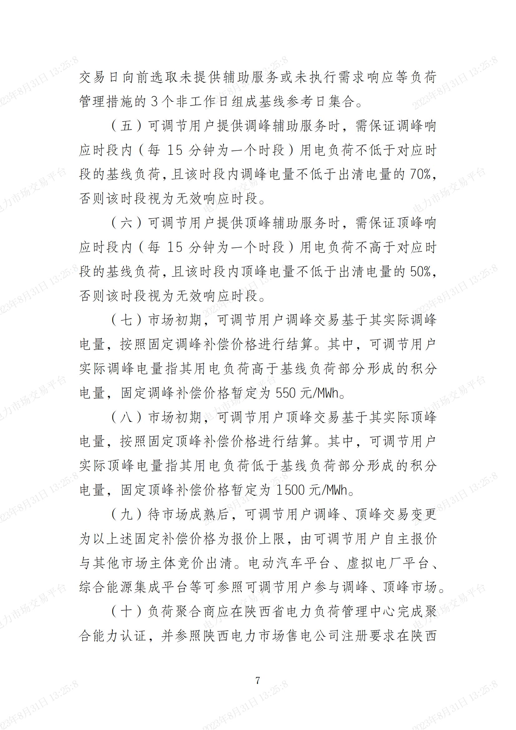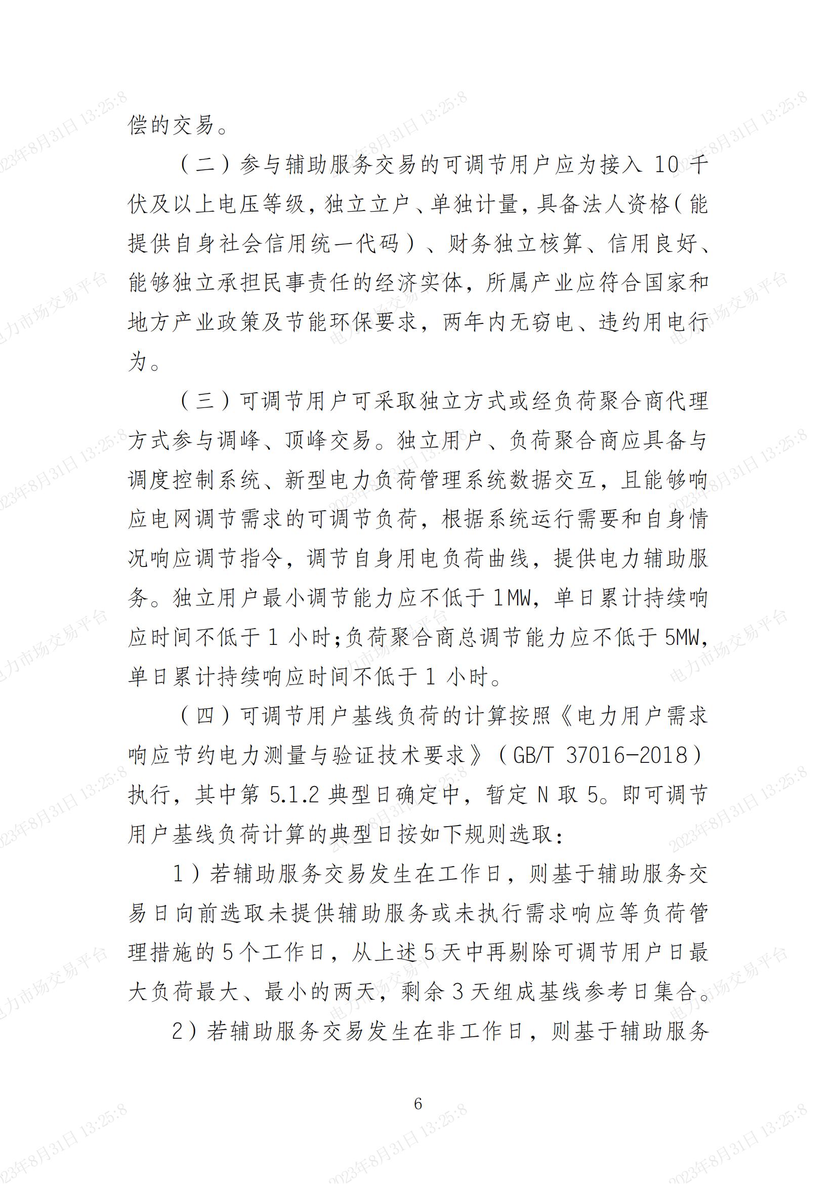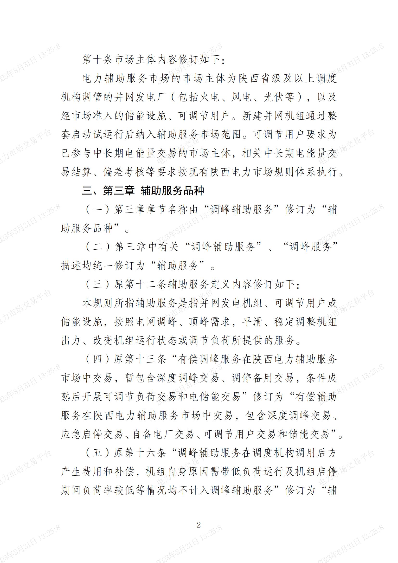 电力辅助服务市场的市场主体为陕西省级及以上调度 机构调管的并网发电厂(包括火电、风电、光伏等),以及 经市场准入的储能设施、可调节用户。