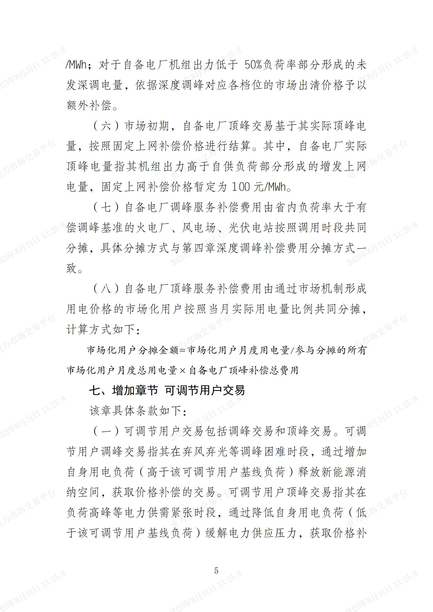 市场初期,自备电厂调峰交易基于其实际调峰电 量,按照固定下网补偿价格及深度调峰补偿价格进行结算。 其中,自备电厂实际调峰电量指其机组出力低于调峰基准部 分形成的未发下网电量,固定下网补偿价格暂定为 300 元/MWh;对于自备电厂机组出力低于 50%负荷率部分形成的未 发深调电量,依据深度调峰对应各档位的市场出清价格予以 额外补偿。