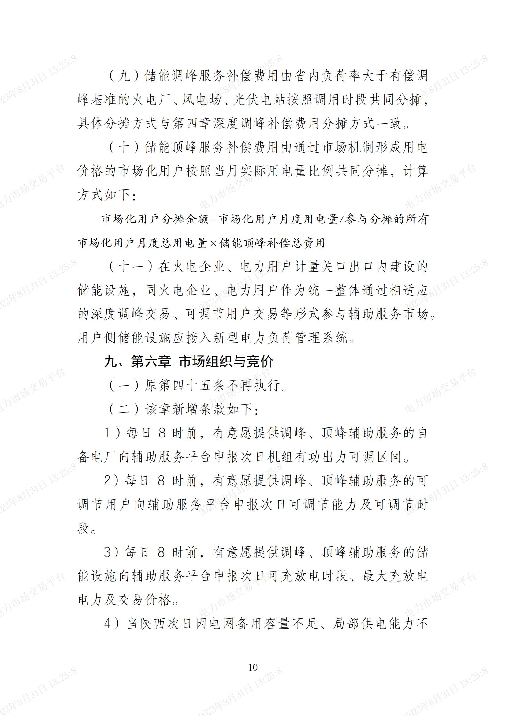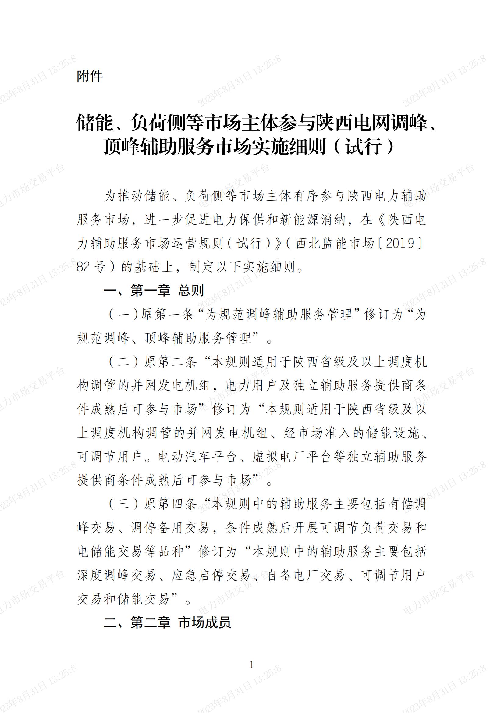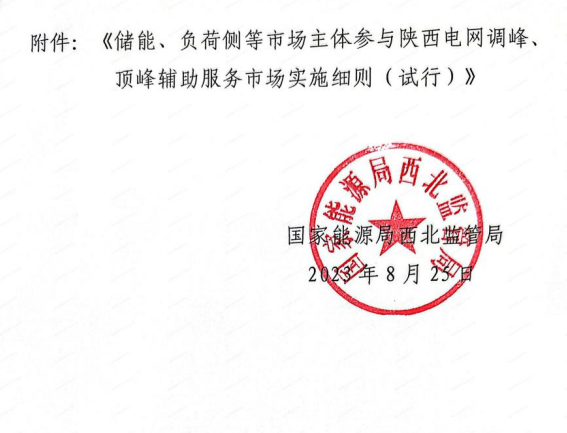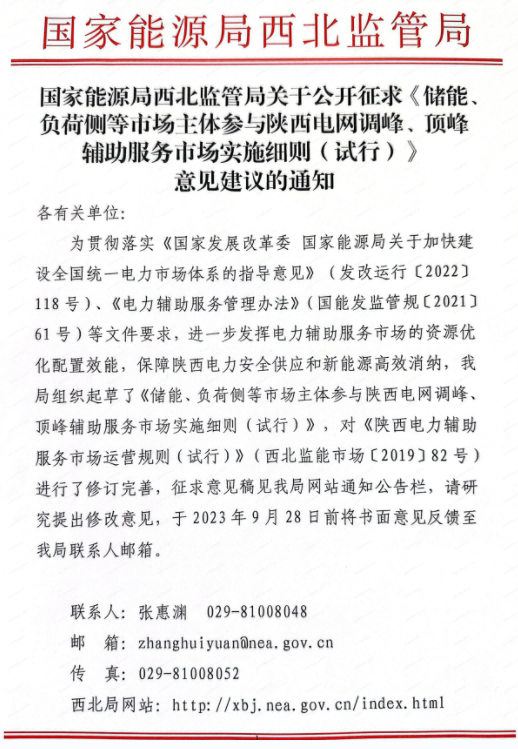 西北能监局日前发布关于公开征求《储能、负荷侧等市场主体参与陕西电网调峰、顶峰辅助服务市场实施细则(试行)》意见建议的通知,西北能监局组织起草了《储能、负荷侧等市场主体参与陕西电网调峰、顶峰辅助服务市场实施细则 (试行)》,对《陕西电力辅助服务市场运营规则(试行)》(西北监能市场[2019]82号)进行了修订完善,征求意见稿见我局网站通知公告栏,请研究提出修改意见,于2023 年9月 28 日前将书面意见反馈至我局联系人邮箱。
