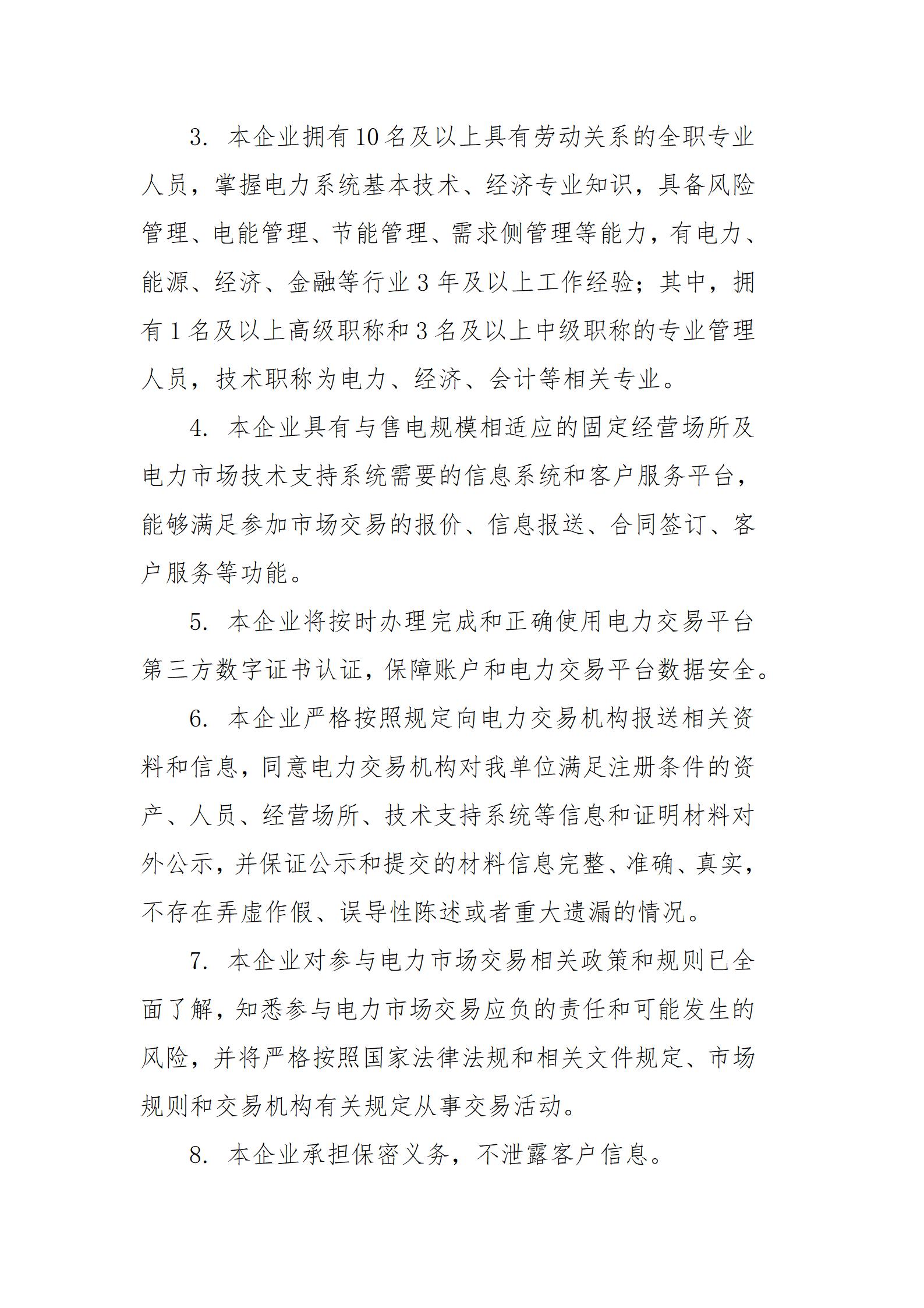 5.信用要求。售电公司法定代表人及主要股东具有良好的财务状况和信用记录,并按照规定要求做出信用承诺,确保诚实守信经营。董事、监事、高级管理人员、从业人员无失信被执行记录。