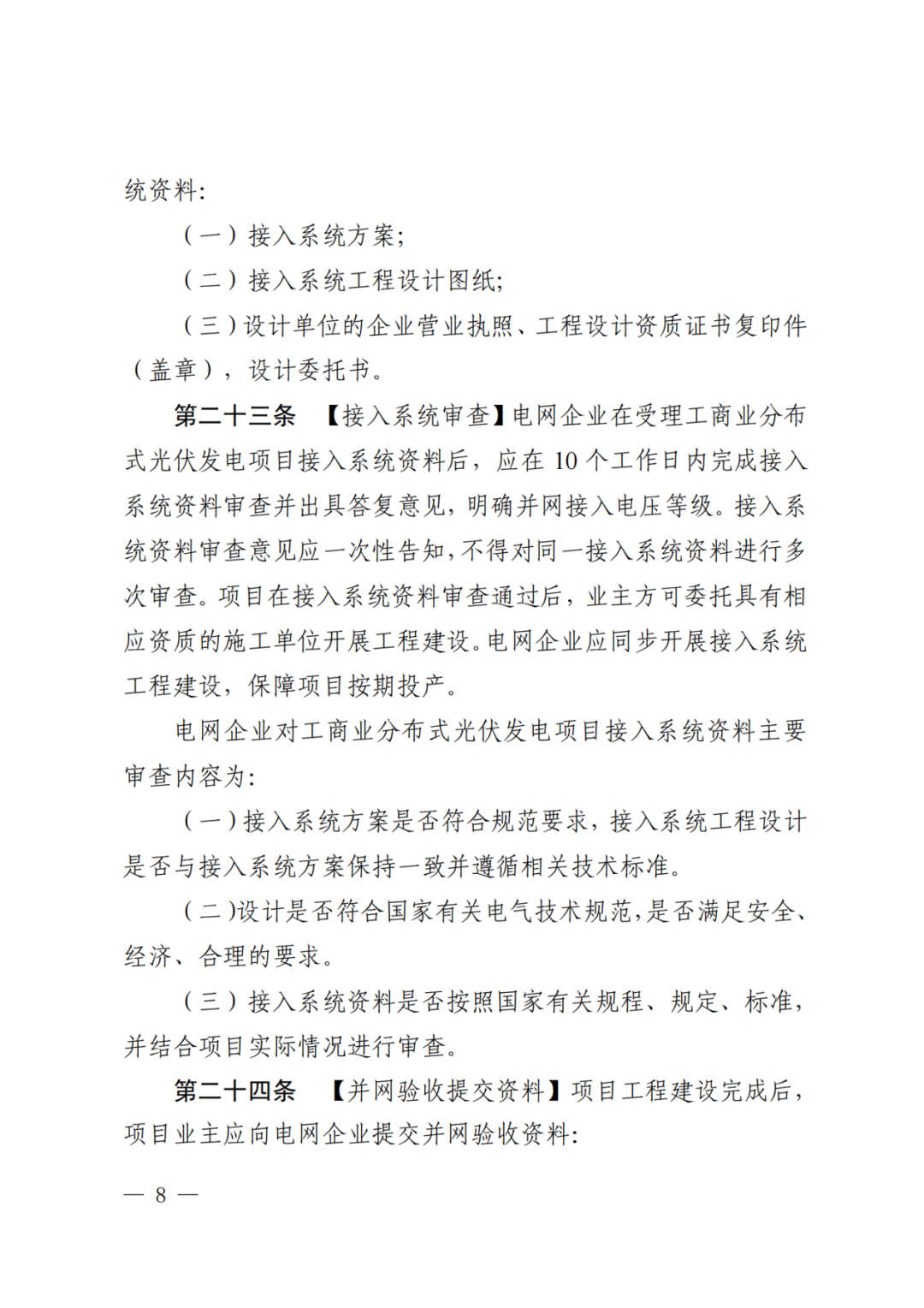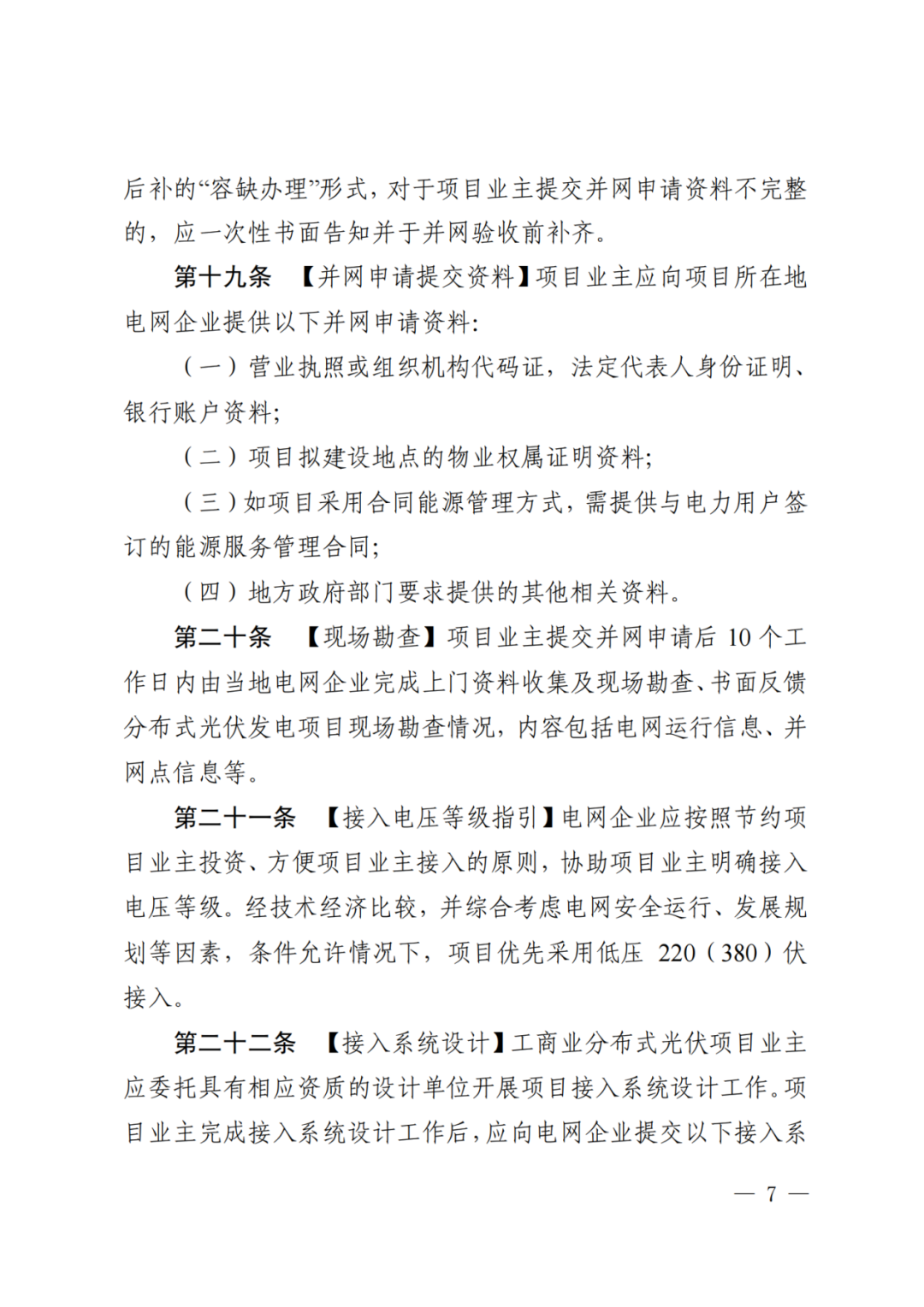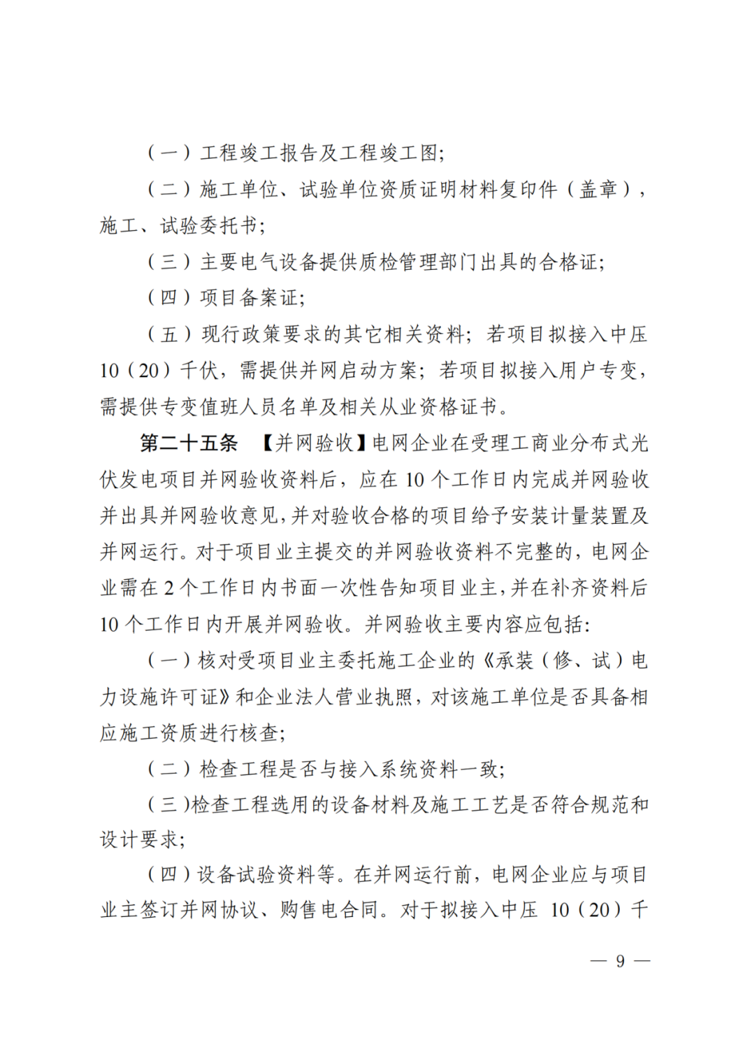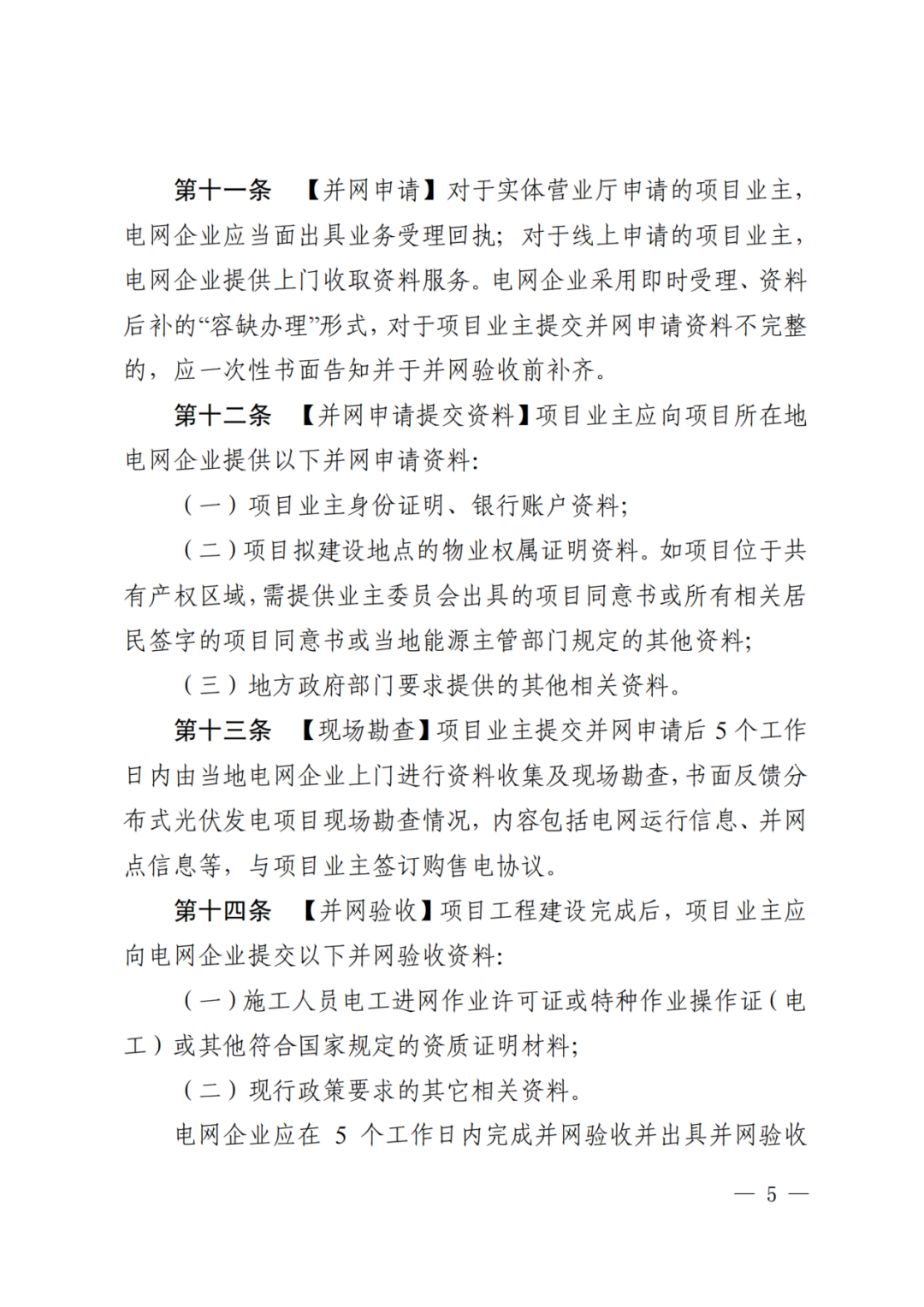 2、现行政策要求的其它相关资料。电网企业应在5个工作日内完成并网验收并出具并网验收意见,并对验收合格的项目给予安装计量装臵及并网运行。对于项目业主提交的并网验收资料不完整的,电网企业应在2个工作日内书面一次性告知项目业主,并在补齐资料后5个工作日内开展并网验收。