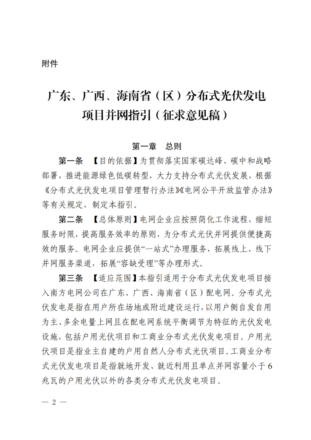 8月3日,国家能源局南方监管局印发了关于公开征求《广东、广西、海南省(区)分布式光伏发电项目并网指引(征求意见稿)》意见的通告。意见稿中对接入南方电网公司广东、广西、海南省(区)配电网的分布式光伏发电项目进行了并网指引。