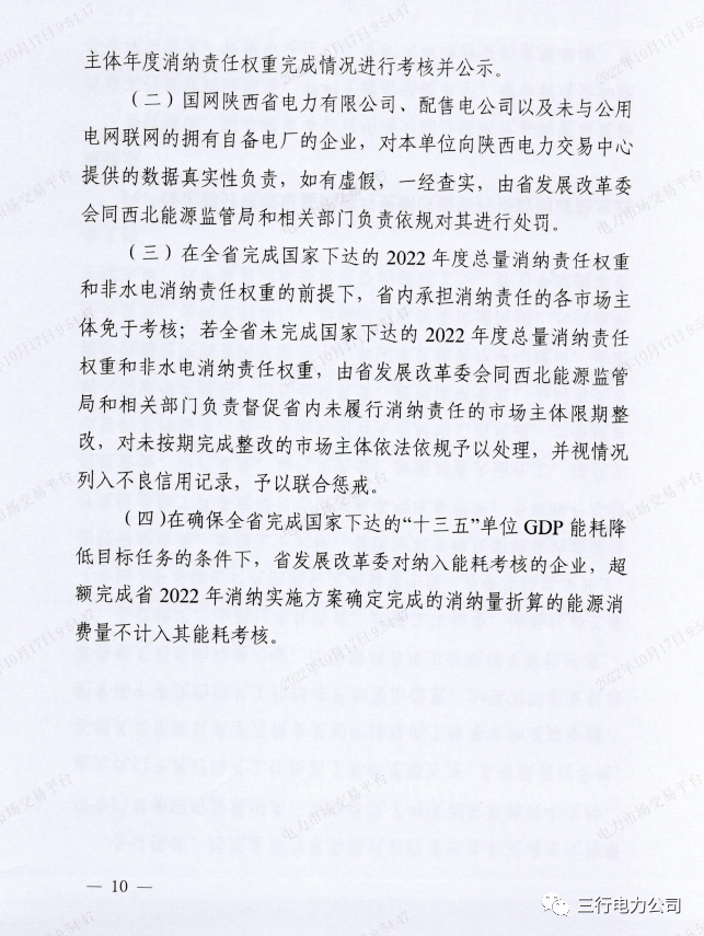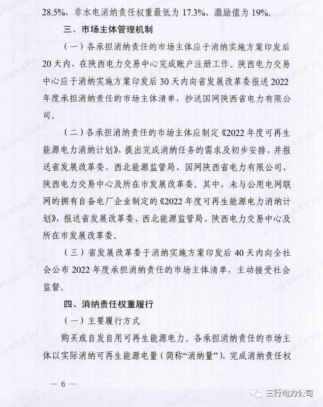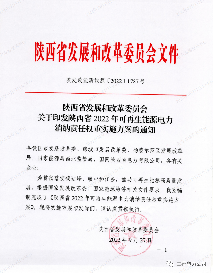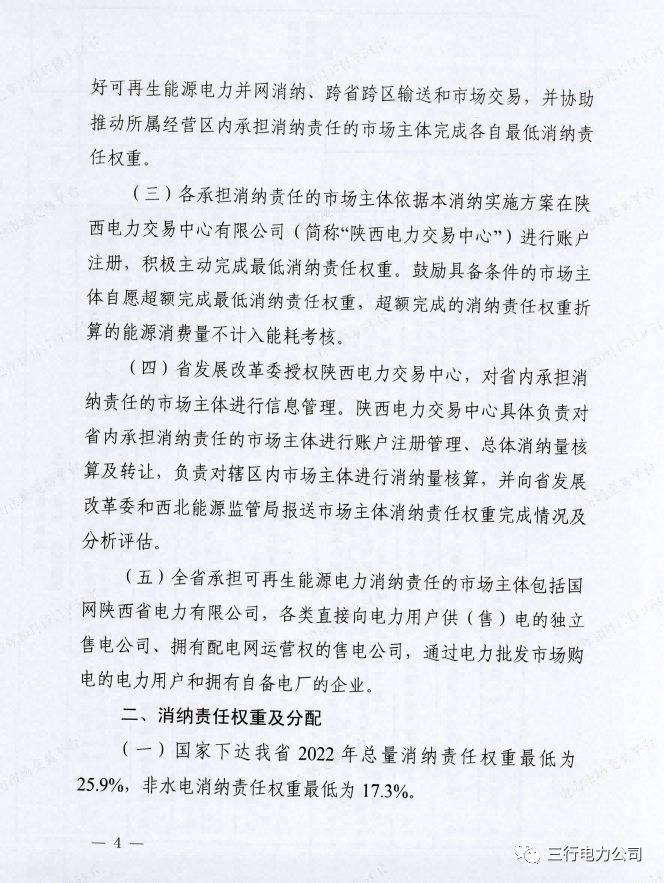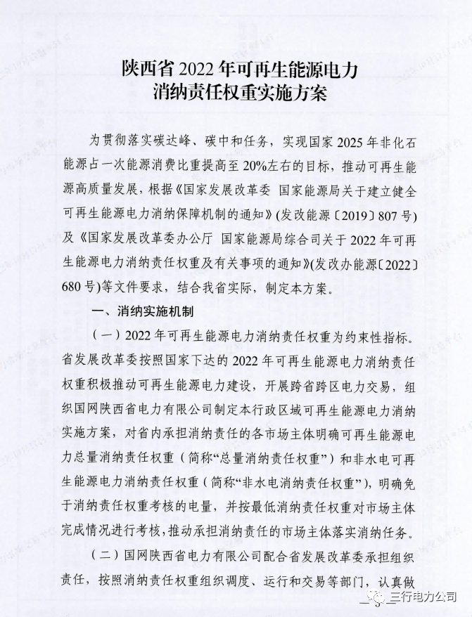 日前陕西省发改委发布陕西省2022年可再生能源电力消纳责任权重实施方案。方案指出,各类直接向电力用户供(售)电独立售电公司承担与其年供(售)电量相对应的消纳责任权重总量消纳责任权重,最低值为25.9%、激励值为28.5%,非水电消纳责任权重最低为17.3%、激励值为19%。