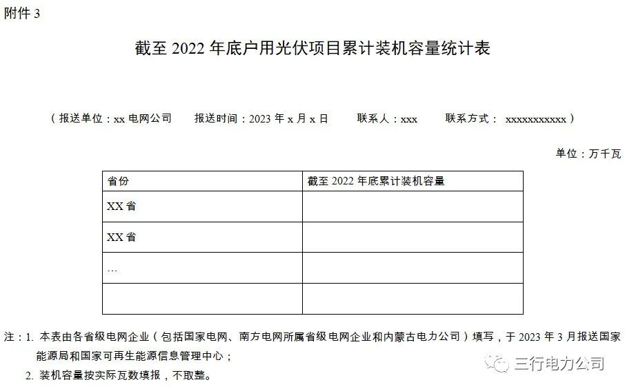 五、请各省级能源主管部门组织各省级电网企业(含内蒙古电力公司)在2023年3月第一次填报数据时按附件3向国家能源局报送所辖经营区域截至2022年底的户用光伏累计装机规模,并抄送国家可再生能源信息管理中心。