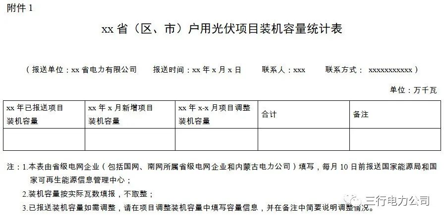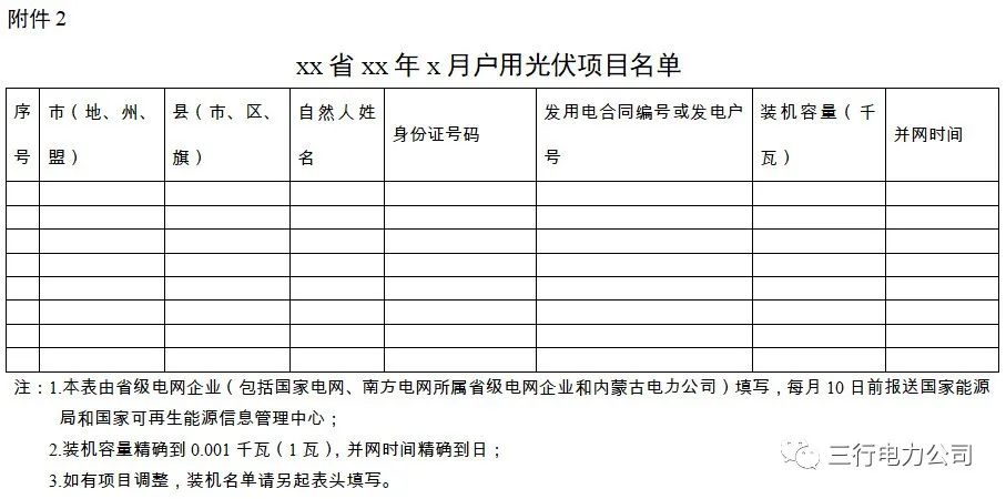 三、请相关省级能源主管部门组织地方电网企业于每月8日前按附件1、2向国家电网公司、南方电网公司所属省级电网企业和内蒙古电力公司报送户用光伏项目信息。各省级电网企业(含内蒙古电力公司)于每月10日前按附件1公布汇总后的全省户用光伏项目信息,于每月12日前按附件1、2报送国家能源局并抄送国家可再生能源信息管理中心。其中,附件2相关信息应与可再生能源发电项目建档立卡信息保持一致。