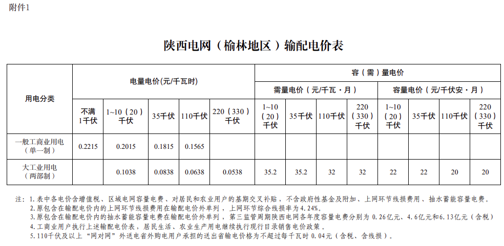 附件1 陕西电网(榆林地区)输配电价表.pdf