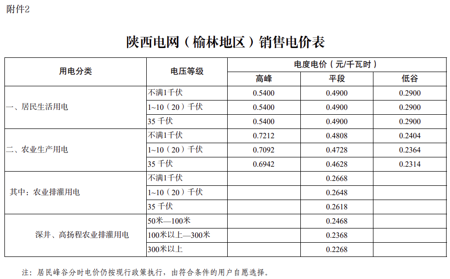一、陕西电网(榆林地区)输配电价分为一般工商业用电(单一制)和大工业用电(两部制),各电压等级输配电价(含增值税、区域电网容量电费、对居民和农业用户的基期交叉补贴)详见附件1。居民生活、农业生产用电继续执行现行目录销售电价政策,详见附件2。